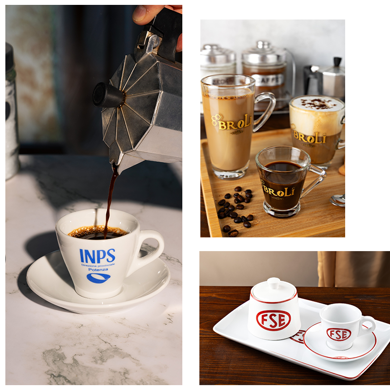 Le nostre tazze in porcellana e vetro personalizzate con la tecnica del Decalco sono la scelta ideale per bar, ristoranti, hotel ed eventi privati. Personalizza le tue Tazze con il logo del tuo locale o con design unici per matrimoni, anniversari o la tua tavola di casa. Le tazze personalizzate aggiungono un tocco di classe e professionalità, rafforzando l'identità del tuo locale o creando ricordi indimenticabili per eventi speciali.